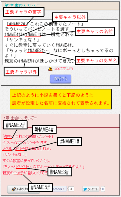 章の詳細、ページ本文内に半角英数字で#NAME1#~#NAME9#を書き込むことで、読者がドリーム設定を楽しむことができます。